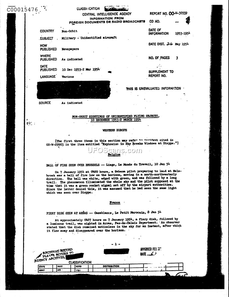 This Central Intelligence Agency report, dated May 26, 1954, compiles information regarding unidentified aerial phenomena observed in Western Europe between December 10, 1953, and March 2, 1954. The document specifically details two sightings occurring on January 7, 1954. In the first instance, a Sabena pilot preparing to land at Melsbroek, Belgium, at 0420 hours, observed a white ball of fire with a long luminous trail moving in a north-northwesterly direction. The pilot noted that the object illuminated the sky and was initially mistaken for a green rocket signal fired by airport authorities, though the authorities denied this. The report suggests this sighting may be related to a light previously observed over Dieppe. In the second instance, at 0427 hours on the same day, a fiery disk with a luminous trail was sighted in Arras, France. An observer reported that the object remained motionless in the sky for a brief moment before flying away and disappearing over the horizon. The document serves as an intelligence summary of these unevaluated reports.