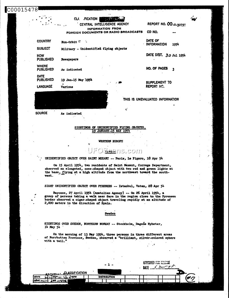 This Central Intelligence Agency report, dated 30 July 1954, compiles information regarding sightings of unidentified flying objects in Western Europe between 19 January and 15 May 1954. The document explicitly states that the information provided is unevaluated. Three specific incidents are detailed. The first occurred on 15 April 1954 in the Correge Department of France, where two residents observed an elongated, cone-shaped object featuring red and green lights at its base, moving from the northwest toward the southwest at a high altitude. The second incident took place on 26 April 1954 near Sare, France, close to the Pyrenees border. A group of individuals observed a cigar-shaped object traveling rapidly at an altitude of 2,000 meters in the direction of Spain. The final incident occurred on the morning of 13 May 1954 in Norrbotten Province, Sweden, where three individuals in three separate areas reported seeing a brilliant, silver-colored sphere with a tail. The report cites various newspaper sources, including Le Figaro and Vatan, as the origin of these accounts.