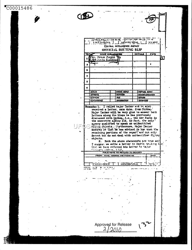 This document is a Central Intelligence Agency Official Routing Slip addressed to Mr. Frank Chapin at the 220 Admin Building. The remarks section details a communication process involving a Major Tacker and an individual named Keyhoe. The author of the note states that they contacted Major Tacker, who had also received a letter from Keyhoe on the same date. The note indicates that Major Tacker intended to respond to both letters in a manner consistent with previous discussions. Specifically, the document asserts that the Air Force is the executive agency and the only agency qualified to speak on the subject of unidentified flying objects. Furthermore, the author notes that Major Tacker assured them that he had advised Keyhoe that the remaining portions of the report in question were not related to unidentified flying objects. The document concludes with a suggestion that a letter be written to Keyhoe to inform him that his correspondence had been referred to the appropriate office.