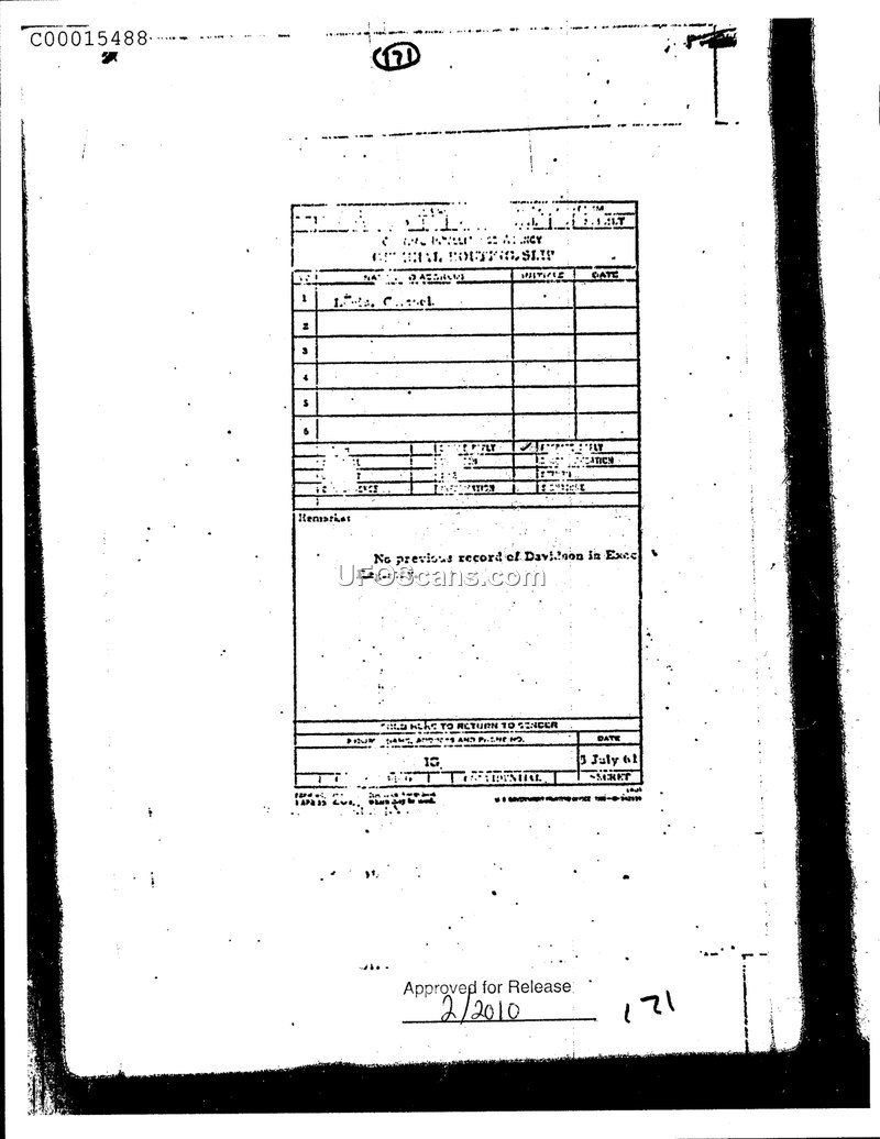 A CIA routing slip from July 1961 confirming that a search of the Executive Registry produced no records for an individual named Davidson.