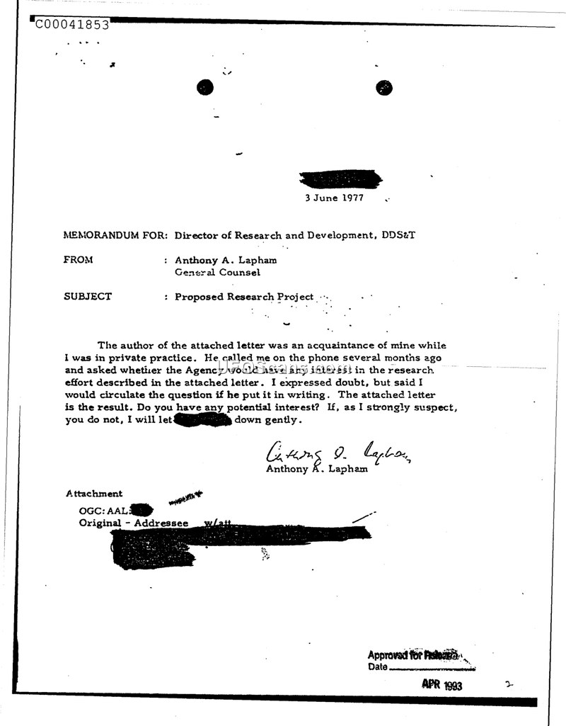 This memorandum, dated 3 June 1977, was authored by Anthony A. Lapham, the General Counsel, and addressed to the Director of Research and Development, DDS&T. The document concerns a proposed research project described in an attached letter. Lapham explains that the author of the attached letter was an acquaintance from his time in private practice. This acquaintance had contacted Lapham by phone several months prior to inquire whether the Agency would have any interest in the research effort described in the letter. Lapham notes that he expressed doubt regarding the proposal but agreed to circulate the inquiry if it were submitted in writing. The memorandum serves as the formal circulation of that written proposal to the Director of Research and Development to determine if there is any potential interest. Lapham concludes by stating that if the Agency has no interest, which he strongly suspects is the case, he will inform the acquaintance accordingly.