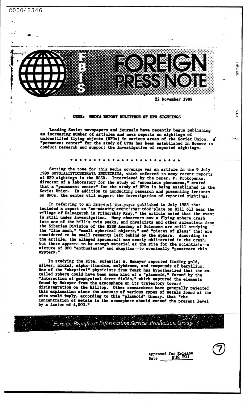 This Foreign Press Note, dated 22 November 1989, details the growing trend of UFO-related media coverage within the Soviet Union. According to the report, Soviet newspapers and journals began publishing an increasing number of articles regarding unidentified aerial phenomena. In response to this public interest, a permanent research center was established in Moscow to investigate these sightings. The document highlights an interview with P. Prokopenko, the director of a laboratory for the study of anomalous phenomena, who confirmed the center's role in conducting research and providing lectures on the subject. A significant portion of the report focuses on a specific incident from July 1988, involving a flying sphere that crashed on Hill 611 near the village of Dalnegorsk in Primorskiy Kray. This event remained under investigation at the time of the report. Scientists from the Siberian Division of the USSR Academy of Sciences were tasked with analyzing debris recovered from the site, which included a 'fine mesh,' 'small spherical objects,' and 'pieces of glass.' Scientist A. Makeyev reported the presence of various elements, including gold, silver, nickel, alpha-titanium, molybdenum, and beryllium compounds. While one physicist from Tomsk hypothesized that the object was a 'plasmoid' formed by the interaction of geophysical force fields, other researchers expressed skepticism, noting that the concentration of metals found at the site would imply atmospheric metal levels 4,000 times higher than current levels.