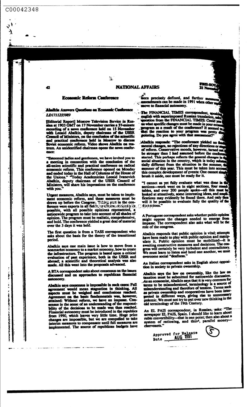 This document is an editorial report from Moscow Television Service regarding a news conference held on 15 November 1990, concerning an all-union scientific and practical conference on radical economic reform in the USSR. Leonid Ivanovich Abalkin, Deputy Chairman of the USSR Council of Ministers, addressed the conference, which concluded after three days of discussions. The primary focus of the conference was the transition from a nonmarket to a market economy, the development of necessary infrastructure, and the implementation of republican financial autonomy. Abalkin emphasized that while consensus on specific details was difficult to achieve, the fundamental need for reform was recognized. He noted that the transition period would be turbulent and required careful management of public opinion. The report includes questions from various international correspondents, including those from TASS, BTA, the Financial Times, and El Pais, covering topics such as the role of the Congress, the potential for public opposition to private ownership, and the introduction of a system of rationing or parallel currency.