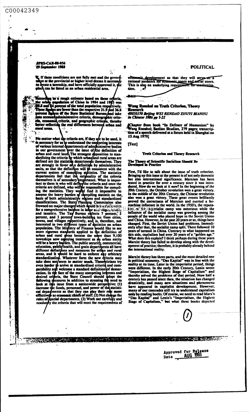 This document, issued by the Joint Publications Research Service on September 19, 1988, contains two distinct sections. The first section addresses the administrative and statistical difficulties in defining urban and rural areas within China. It highlights that the State Statistical Bureau, the State Planning Commission, and the Ministry of Finance hold differing views on how to classify urban residential areas, which complicates the compilation of national statistics. The text suggests that the government must reconcile these competing interests to ensure accurate economic development planning. The second section is a theoretical piece titled 'Truth Criterion and Theory Research,' which features a chapter from Wang Ruoshui's book 'In Defence of Humanism.' This section explores the application of Marxist theory in the contemporary era, arguing that while Marxism has been tested for over a century, it must evolve alongside modern developments. The author reflects on the historical shifts in the socialist camp and the need for comrades to move beyond rote reading of classic texts like 'Das Kapital' and Lenin's 'Imperialism, the Highest Stage of Capitalism' to better understand current international realities.