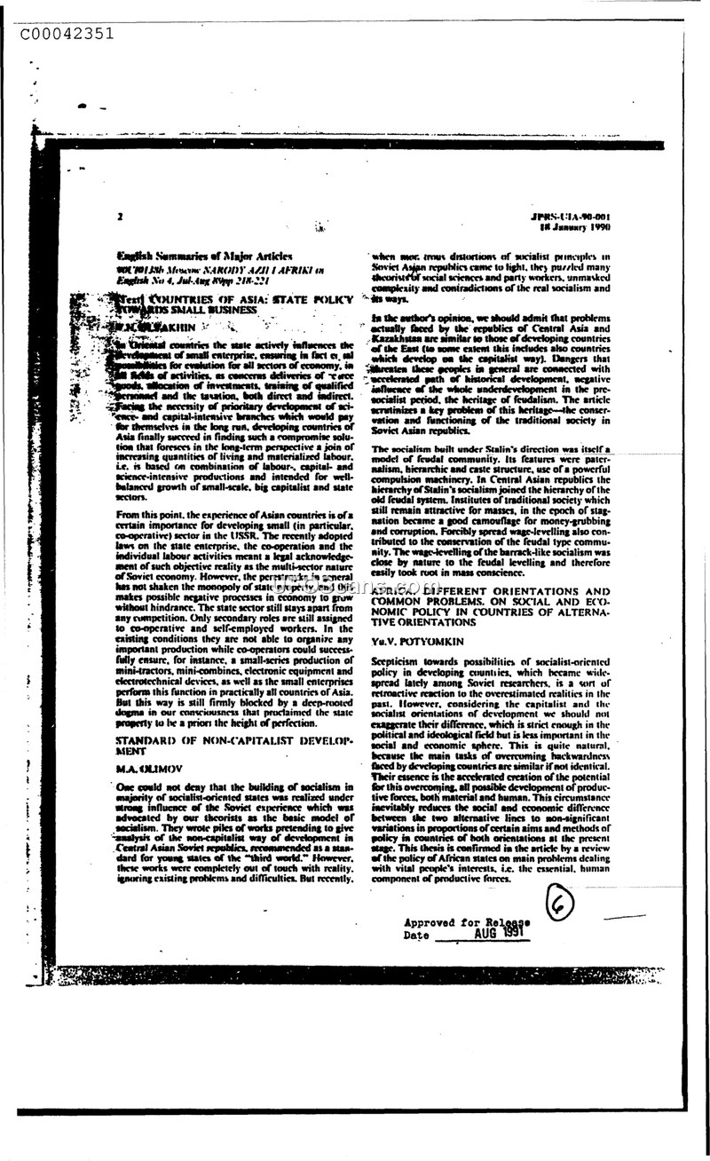 This document, dated January 18, 1990, provides English summaries of major articles published in the journal 'NARODY AZII I AFRIKI' (No. 4, July-August 1989). The content focuses on the political and economic development of countries in Asia and Africa, specifically examining the efficacy of socialist-oriented policies. One article, authored by M.A. Olimov, critiques the previous application of Soviet-style socialism in the 'third world,' arguing that these models were often detached from reality and ignored existing local problems. The summary notes that recent revelations regarding distortions of socialist principles in Soviet Central Asian republics have highlighted the complexity of these issues. A second article by Yu.V. Potyomkin addresses the skepticism surrounding socialist-oriented policies in developing countries. Potyomkin argues that while there is a need to overcome historical backwardness, the focus should remain on the human component of productive forces rather than rigid adherence to ideological models. The document reflects a period of critical re-evaluation within Soviet academic circles regarding the success and applicability of socialist development strategies in the developing world.