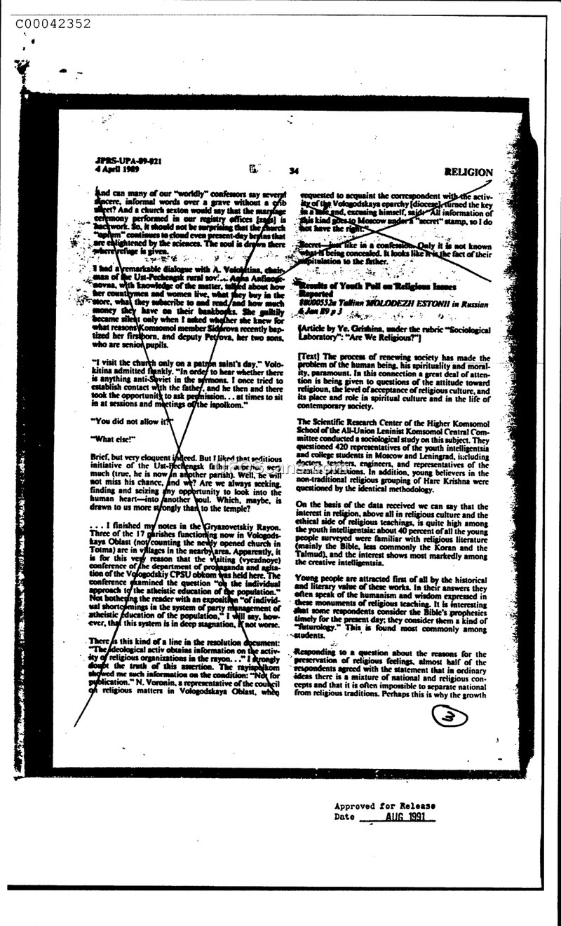 This document reports on 1989 sociological findings regarding religious interest among Soviet youth and local administrative efforts to manage religious activities. It highlights a disconnect between state-mandated atheism and the continued cultural relevance of religious texts.