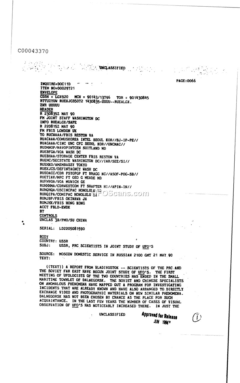 This intelligence report, issued by FBIS London on May 23, 1990, details a collaborative effort between Soviet and Chinese scientists to study Unidentified Aerial Phenomena (UFOs). According to the report, which cites a Moscow Domestic Service broadcast from May 21, 1990, the first meeting of these ufologists took place in the small maritime town of Dalnegorsk in the Soviet Far East. The specialists have formally established a joint program to investigate anomalous phenomena. As part of this cooperation, the researchers have agreed to share video and photographic evidence related to these sightings. The report notes that the region has experienced a significant increase in visual observations of UFOs over the preceding few years.