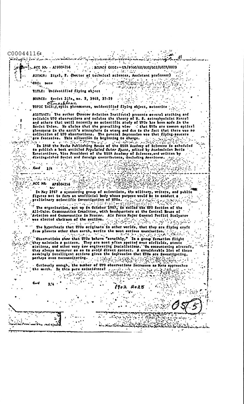 This document is an intelligence abstract summarizing an article by F. Zigel, a Doctor of Technical Sciences and Assistant Professor, published in 'Soviet Life' (No. 2, 1968). The abstract details a significant shift in the Soviet scientific community's approach to Unidentified Flying Objects (UFOs). Zigel, representing the Moscow Aviation Institute, argues against the prevailing theory—attributed to U.S. astrophysicist Kenzel—that UFOs are merely optical phenomena in the earth's atmosphere. He asserts that the previous dismissal of UFOs as fantasies is changing. The document reports that in May 1967, a group of scientists, military personnel, and public figures convened to initiate a preliminary scientific investigation into UFOs. This led to the establishment of the 'UFO Section' of the All-Union Cosmonautics Committee in October 1967, headquartered at the Central House of Aviation and Cosmonautics in Moscow, with Air Force Major General Porfiri Stolyarov serving as chairman. Furthermore, the document mentions that the Nauka Publishing House of the USSR Academy of Sciences scheduled the publication of a book titled 'Populated Outer Space,' edited by Academician Boris Konstantinov, which includes contributions from both Soviet and foreign experts. Regarding the nature of the phenomena, the document states that observations suggest UFOs behave 'sensibly.' They are reported to maintain patterns in group formations and are frequently observed near sensitive locations such as airfields and atomic stations. The author notes that these objects consistently maneuver to avoid direct contact with aircraft, leading to the impression that they are conducting investigations or reconnaissance. The document concludes with a rhetorical question regarding the correlation between the frequency of UFO observations and the proximity of Mars to Earth.
