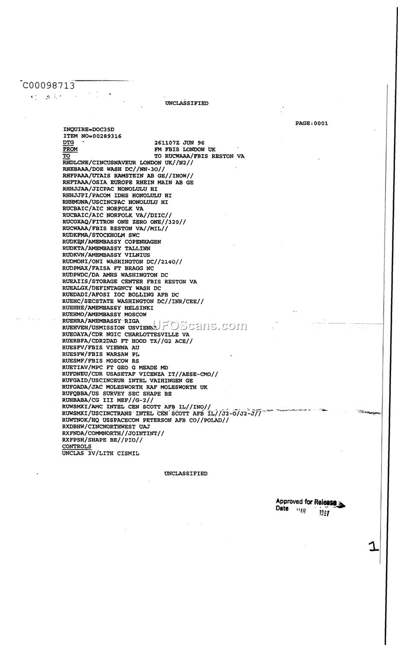 This document is a transmission log generated by the Foreign Broadcast Information Service (FBIS) in London, dated June 26, 1996. It serves as a routing record for a specific item, identified as ITEM NO=00289316. The document lists a wide array of military and intelligence recipients, including various US embassies, naval commands, and intelligence centers across Europe and the Pacific. The document is marked as unclassified and was approved for release in March 1997. It contains no narrative content, intelligence findings, or reports of UAP sightings, functioning strictly as an administrative record of communication distribution.