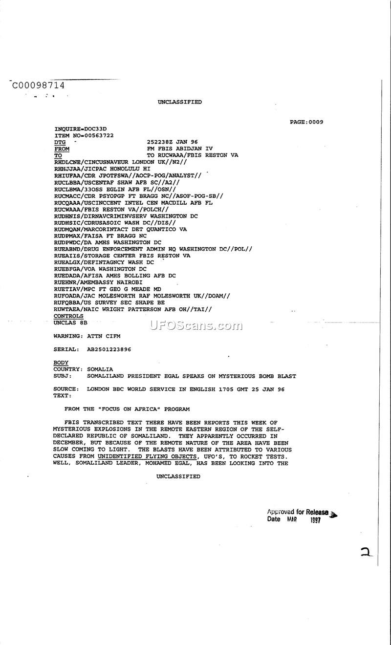 This document reports on mysterious explosions in Somaliland in December 1995. The causes are currently under investigation by Somaliland leader Mohamed Egal and have been attributed to various sources, including UFOs and rocket tests.