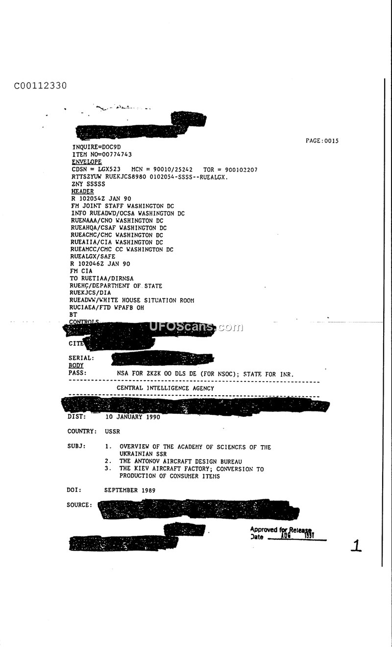 This intelligence assessment, issued by the Central Intelligence Agency on January 10, 1990, provides a high-level overview of three specific entities within the Ukrainian SSR as of September 1989. The document focuses on the Academy of Sciences of the Ukrainian SSR, the Antonov Aircraft Design Bureau, and the Kiev Aircraft Factory. A primary theme of the report is the conversion of the Kiev Aircraft Factory to the production of consumer items. The document was distributed to various high-level government and military intelligence bodies, including the National Security Agency, the Department of State, the Defense Intelligence Agency, the White House Situation Room, and the Foreign Technology Division at Wright-Patterson Air Force Base.
