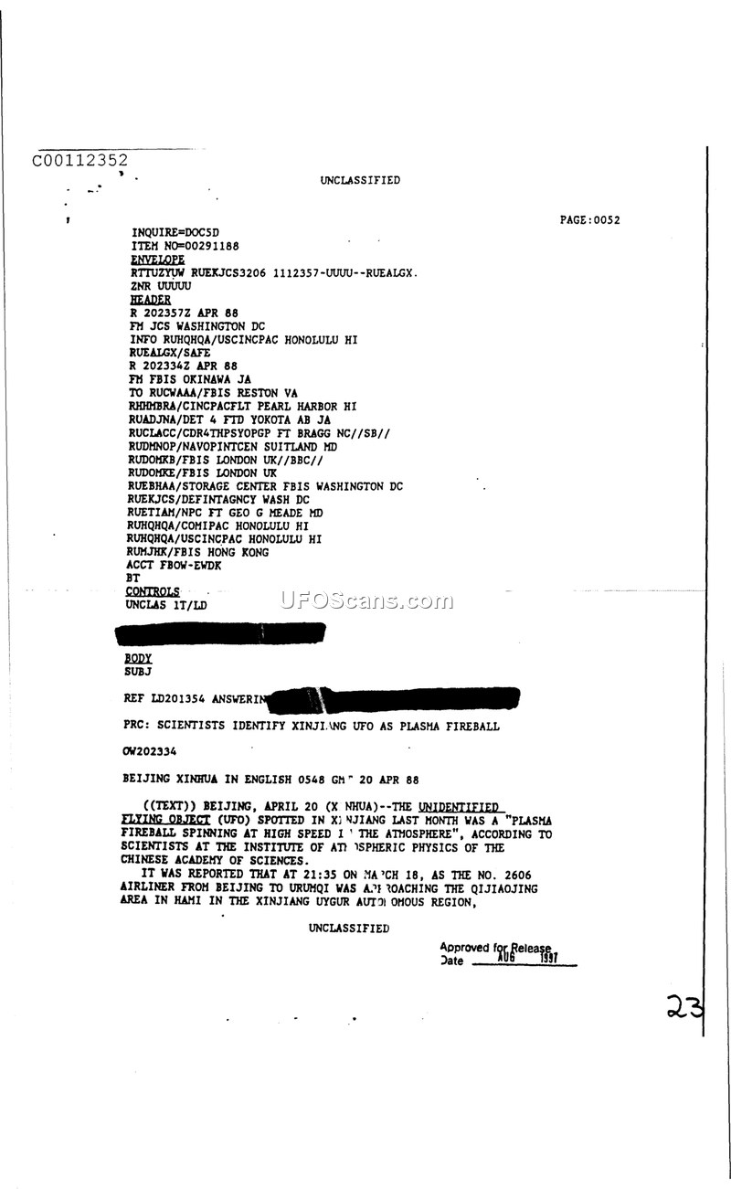 A 1988 intelligence report confirms that Chinese scientists identified a UFO sighted by an airliner crew in Xinjiang as a plasma fireball. The sighting occurred on March 18, 1988, near Hami.