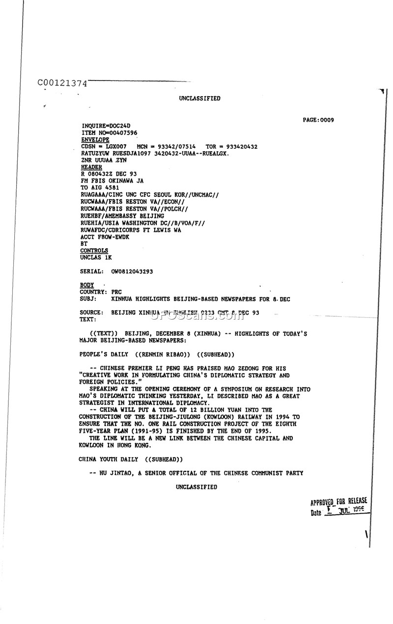 This document is a press summary compiled by the Foreign Broadcast Information Service (FBIS) in Okinawa, dated December 8, 1993. It provides highlights from major Beijing-based newspapers as reported by Xinhua. The summary notes that Chinese Premier Li Peng praised Mao Zedong for his contributions to China's diplomatic strategy and foreign policies during a symposium. Additionally, the report mentions that China planned to invest 12 billion yuan into the construction of the Beijing-Jiulong (Kowloon) railway in 1994 to ensure the project's completion by the end of 1995, serving as a new link between the Chinese capital and Hong Kong. Finally, the document briefly identifies Hu Jintao as a senior official of the Chinese Communist Party.