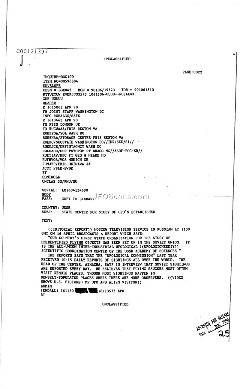 This intelligence report, dated April 16, 1990, documents the establishment of the first state-sanctioned organization in the Soviet Union dedicated to the study of unidentified flying objects. According to a Moscow Television Service broadcast, this entity is known as the All-Union Inter-Industrial Ufological Scientific Coordination Center, operating under the auspices of the USSR Academy of Sciences. The report notes that the center received between 10 and 15 daily reports of sightings from around the world. The head of the center, identified as Azhazha, stated in an interview that sightings are reported daily in the Soviet Union and expressed his belief that flying saucers appear most frequently in remote areas, although they are more commonly observed in densely populated regions due to the higher concentration of observers. The report also mentions that video footage of UFOs and alien visitors was presented during the broadcast.
