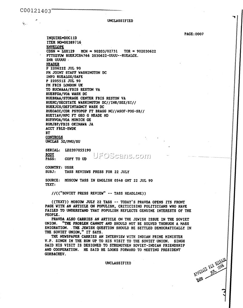 This document is a press review compiled by the Foreign Broadcast Information Service (FBIS) in London, dated July 22, 1990. It summarizes key topics covered by the Soviet newspaper Pravda on that date. The report highlights three main areas of focus: a critique of politicians who fail to understand the role of populism in reflecting the genuine interests of the people; an article addressing the Jewish issue in the Soviet Union, specifically regarding mass emigration and the need for a democratic settlement; and an interview with Indian Prime Minister V.P. Singh. Regarding the latter, the report notes that Singh's visit to the Soviet Union is intended to strengthen bilateral friendship and cooperation, and that he expressed an interest in meeting with President Gorbachev.