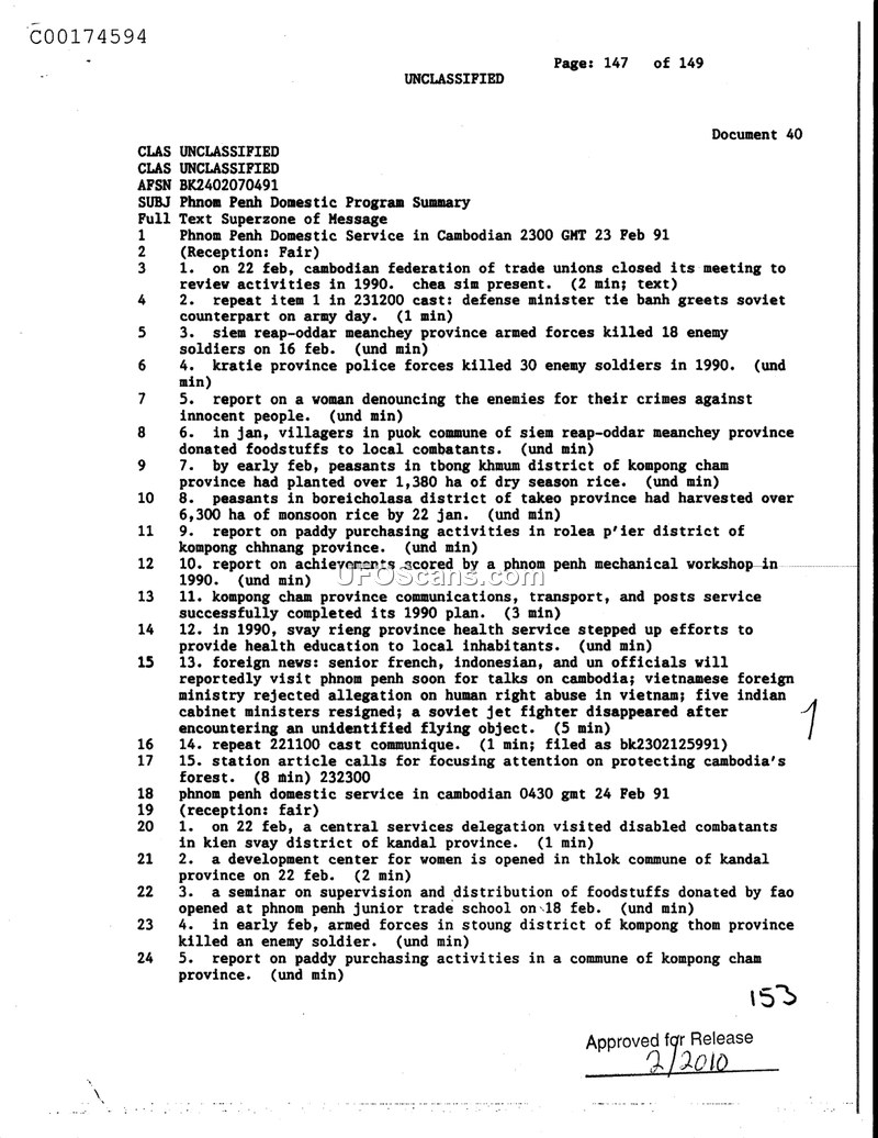 This document is a summary of Cambodian domestic news broadcasts from February 1991. It includes a brief mention of a Soviet jet fighter disappearing after encountering an unidentified flying object.