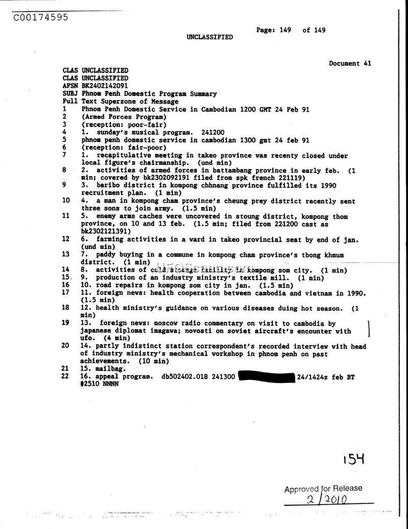 This document is a summary of a Cambodian domestic radio broadcast from February 24, 1991. It lists various domestic and international news items, including a brief mention of a Soviet aircraft's encounter with a UFO.