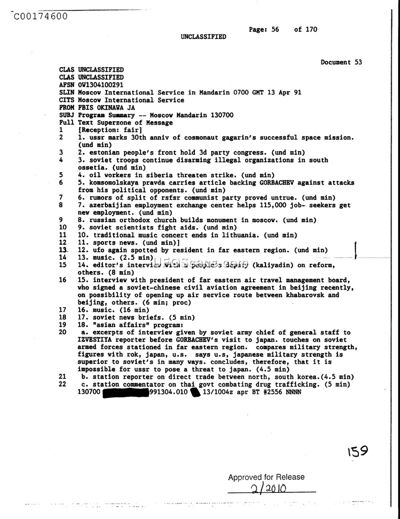 This document is a program summary of a Moscow International Service broadcast in Mandarin, dated April 13, 1991, transmitted by FBIS Okinawa. The summary outlines 18 segments of the broadcast, covering a variety of political, social, and military topics within the Soviet Union. Notable segments include the 30th anniversary of cosmonaut Gagarin's space mission, political developments involving Gorbachev, labor issues in Siberia, and religious developments in Moscow. Of particular interest is item 12, which briefly notes that a UFO was again spotted by a resident in the far eastern region. The broadcast also included an interview with the president of the far eastern air travel management board regarding a civil aviation agreement between Khabarovsk and Beijing, and an analysis of Soviet military strength in the far eastern region relative to the United States and Japan.