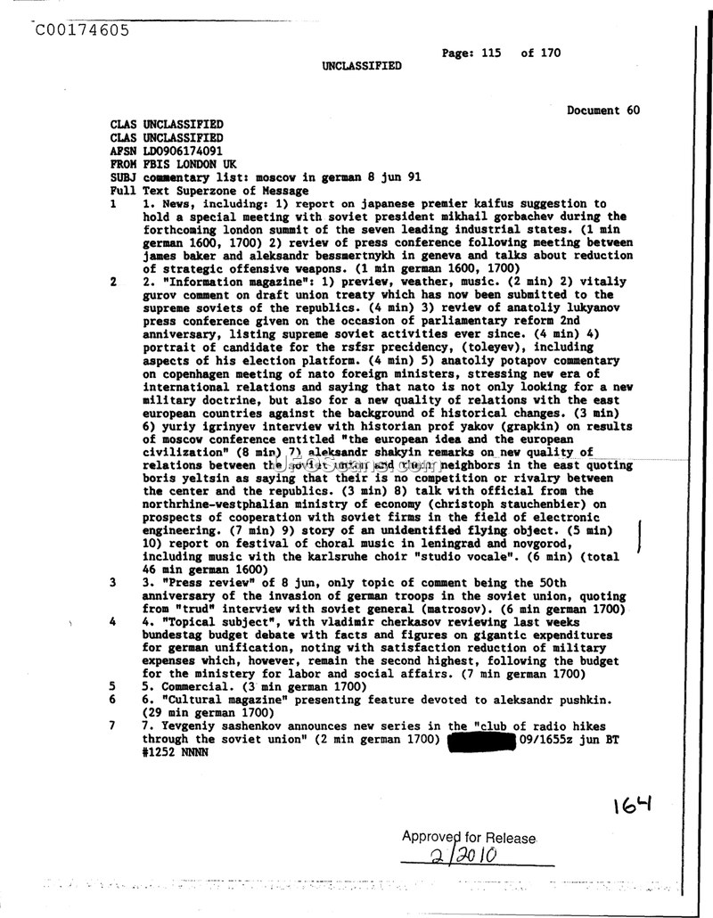 This document is a Foreign Broadcast Information Service (FBIS) commentary list from London, dated June 8, 1991. It provides a summary of various news reports and features broadcast in German from Moscow. The content covers a wide range of political and economic topics relevant to the Soviet Union at the time, including international relations, the upcoming London summit of industrial states, and domestic political developments. Among the items listed is a brief mention of a story regarding an unidentified flying object, which was allocated five minutes of broadcast time. Other segments include discussions on the reduction of strategic offensive weapons, the RSFSR presidency, NATO foreign ministers' meetings, and economic cooperation between the Soviet Union and Northrhine-Westphalia. The document also notes cultural features, such as a segment on Aleksandr Pushkin and a report on a choral festival in Leningrad and Novgorod.