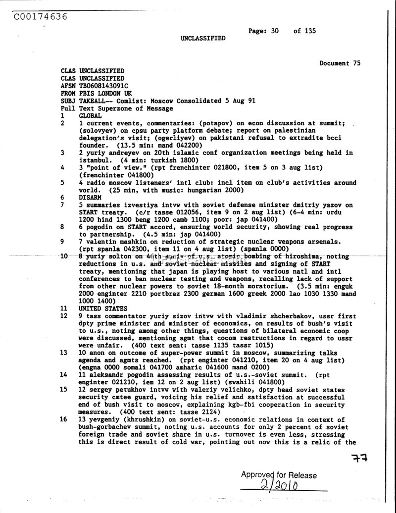 This document is a Foreign Broadcast Information Service (FBIS) compilation from London, dated August 5, 1991, summarizing news and commentary from Moscow. The report covers a variety of topics, primarily focusing on the aftermath of the U.S.-Soviet summit and the START treaty. Key segments include discussions on economic issues at the summit, the CPSU party platform debate, and the Pakistani refusal to extradite the founder of BCCI. International events are also noted, such as the 20th Islamic Conference Organization meetings in Istanbul and the 46th anniversary of the U.S. atomic bombing of Hiroshima. The document highlights Soviet perspectives on the START treaty, including an interview with Soviet Defense Minister Dmitriy Yazov and commentary by Yuriy Solton regarding nuclear disarmament and the 18-month moratorium. Furthermore, the report details U.S.-Soviet economic relations, featuring an interview with Vladimir Shcherbakov, the USSR first deputy prime minister and minister of economics, regarding bilateral economic cooperation and COCOM restrictions. Other segments include an assessment of the summit by Aleksandr Pogodin, an interview regarding KGB-FBI cooperation in security measures by Sergey Petukhov, and an analysis of U.S.-Soviet economic relations by Yevgeniy (Khrushkin).