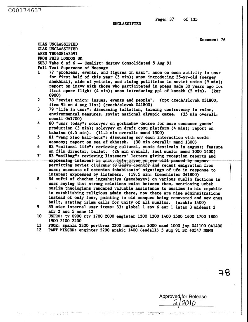 This document is a consolidated report from the Foreign Broadcast Information Service (FBIS) in London, dated August 5, 1991. It provides a summary of various Soviet media broadcasts and news items. The report covers a wide range of topics, including economic activity in the USSR, the introduction of political figures such as Sergey Shakhrai, reports on space flight, and discussions regarding the Soviet economy, inflation, and the CPSU platform. Notably, item 7 in the report, titled 'mailbag', mentions that the broadcast reviewed listeners' letters. These letters included reception reports and expressed interest in the USSR, as well as accounts of Estonian inhabitants' sightings of UFOs in response to interest expressed by listeners. The document also details various internal Soviet items, including religious administration in Chechen-Ingushetia and the renovation of mosques. The report concludes with technical details regarding broadcast monitoring.