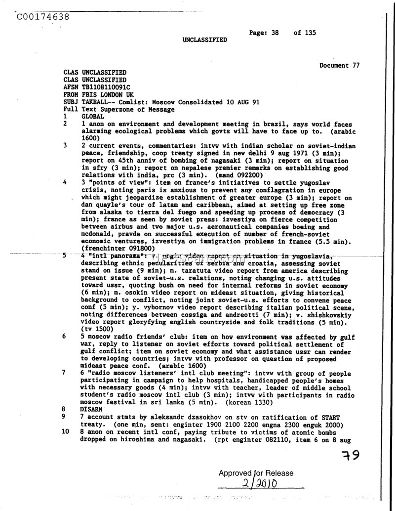 This document is a Foreign Broadcast Information Service (FBIS) compilation from London, dated August 10, 1991, summarizing various news reports and broadcasts from Moscow. The document covers a wide range of international and domestic topics. Global issues include an environmental meeting in Brazil regarding ecological concerns. Current events coverage features an interview with an Indian scholar regarding a Soviet-Indian treaty, reports on the 45th anniversary of the bombing of Nagasaki, the situation in Yugoslavia, and efforts to establish good relations between India and the PRC. The 'Points of View' section discusses French initiatives regarding the Yugoslav crisis, Dan Quayle's tour of Latin America and the Caribbean, and economic competition between Airbus and U.S. aeronautical companies like Boeing and McDonald. The 'International Panorama' segment provides video reports on the situation in Yugoslavia, Soviet-U.S. relations, the Middle East conflict, Italian politics, and English folk traditions. Other segments cover the Moscow Radio Friends' Club, including discussions on the Gulf War's environmental impact and a Middle East peace conference. Finally, the document notes a radio meeting regarding a campaign to help hospitals and handicapped homes, as well as statements by Aleksandr Dzasokhov regarding the ratification of the START treaty and a tribute to the victims of the atomic bombings of Hiroshima and Nagasaki.