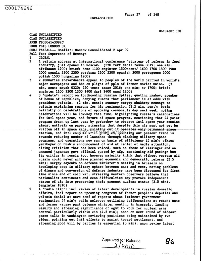 This document is a Foreign Broadcast Information Service (FBIS) daily report from London, dated April 2, 1992, summarizing consolidated news from Moscow. The report covers several key political and social developments in the post-Soviet landscape. President Yeltsin is noted for addressing an international conference regarding food industry reforms. The report highlights an appeal by Shevardnadze concerning the plight of the peoples of the former Soviet Union. Domestic political stability is addressed through a report on the Speaker of the House of Republics, Ryabov, who denied rumors of a rift between the parliament and President Yeltsin. Additionally, the document mentions the resignation of Sergey Shakhray and provides a summary of his message to Yeltsin. Boris Belitskiy discusses the upcoming Cosmonauts Day, noting that celebrations will be low-key and that the 24-point space program initiated by Gorbachev remains largely on paper, with a shift toward efficiency and reduced military space launches. International relations and economic aid are also covered, including Viktor Yenikeyev's report on President Bush's aid announcement, which faced criticism from figures such as Kissinger. Finally, the report touches on military cooperation, with Sergey Sayenko covering a defense minister's meeting in Brussels regarding East-West military cooperation, and Vadim Solovyev reporting on NATO and former Warsaw Pact defense minister meetings concerning nuclear arms control.