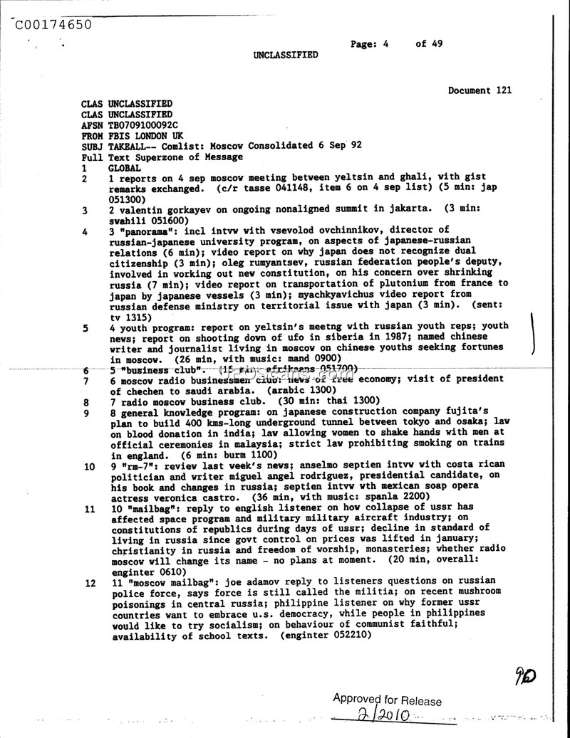 This document is a consolidated media report from FBIS London, dated September 6, 1992, summarizing various broadcasts and news segments from Moscow. The report covers a wide range of topics, including political meetings between Boris Yeltsin and Boutros Boutros-Ghali, the nonaligned summit in Jakarta, and various domestic Russian issues such as the drafting of a new constitution and the transportation of plutonium. Notably, item 5 of the report mentions a youth program that included a report on the shooting down of a UFO in Siberia in 1987. The document also details cultural and social segments, including interviews with Costa Rican politician Miguel Angel Rodriguez and Mexican actress Veronica Castro, as well as listener questions addressed by Joe Adamov regarding the Russian police force and social issues in the former USSR.