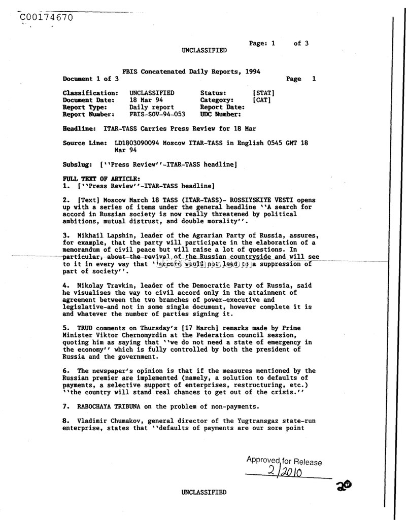 This document is a Foreign Broadcast Information Service (FBIS) daily report dated March 18, 1994, summarizing press coverage from Russian media outlets. The report highlights the prevailing political and economic climate in Russia during that period. The primary focus is on the search for civil accord within Russian society, which is described as being threatened by political ambitions, mutual distrust, and double morality. Key political figures are cited, including Mikhail Lapshin of the Agrarian Party of Russia, who expresses concerns regarding the revival of the Russian countryside and the potential for civil accord to lead to the suppression of parts of society. Nikolay Travkin of the Democratic Party of Russia is noted for his view that civil accord can only be achieved through agreement between the executive and legislative branches of power. The report also covers economic issues, specifically referencing comments made by Prime Minister Viktor Chernomyrdin at a Federation Council session regarding the state of the economy and the rejection of a state of emergency. Additionally, the report mentions the issue of non-payments in the economy, with Vladimir Chumakov, general director of the Yugtransgaz state-run enterprise, identifying payment defaults as a significant problem for the country.
