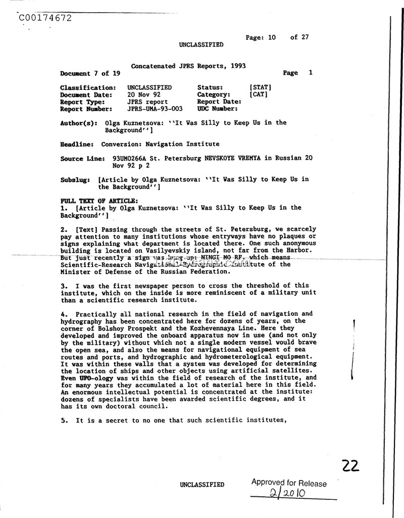 This 1992 report identifies a Russian military-affiliated research institute in St. Petersburg that has conducted research into UFO-ology. The facility, NINGI MO RF, specializes in navigation, hydrography, and satellite-based positioning systems.