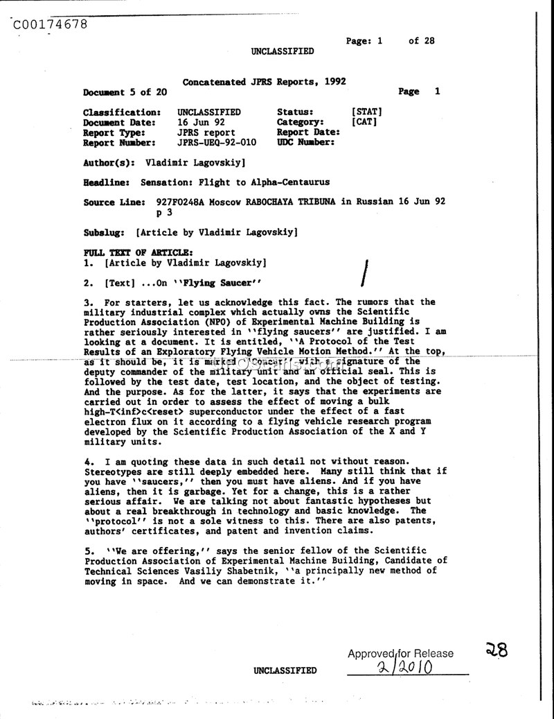 This document, a JPRS report dated June 16, 1992, features an article by Vladimir Lagovskiy titled 'Sensation: Flight to Alpha-Centaurus,' originally published in the Russian newspaper Rabochaya Tribuna. The author claims that the Russian military-industrial complex, specifically the Scientific Production Association (NPO) of Experimental Machine Building, is actively researching 'flying saucers.' Lagovskiy references a specific document he claims to have seen, titled 'A Protocol of the Test Results of an Exploratory Flying Vehicle Motion Method,' which bears the signature of a military deputy commander and an official seal. According to the author, this protocol details experiments involving the assessment of bulk high-temperature superconductors under the influence of a fast electron flux, conducted as part of a flying vehicle research program. Lagovskiy argues that this research represents a serious technological breakthrough rather than a search for extraterrestrial life. He quotes Vasiliy Shabetnik, a senior fellow at the NPO and Candidate of Technical Sciences, who claims they have developed a 'principally new method of moving in space' and are prepared to demonstrate it.