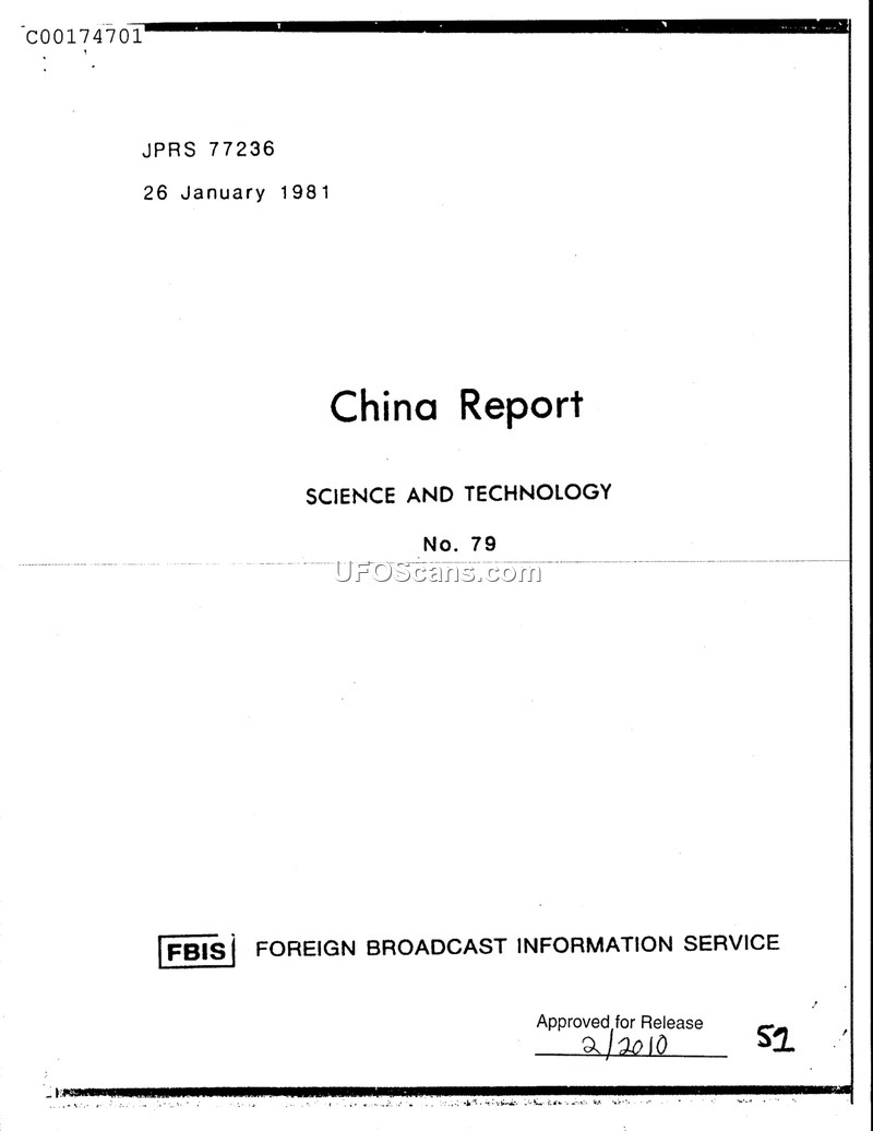 This document is the cover page for a report titled 'China Report: Science and Technology, No. 79,' issued by the Foreign Broadcast Information Service (FBIS) on January 26, 1981. The document bears the reference number JPRS 77236. It is a formal government publication intended to disseminate information regarding scientific and technological developments within China. The document has been approved for release as of February 2010.