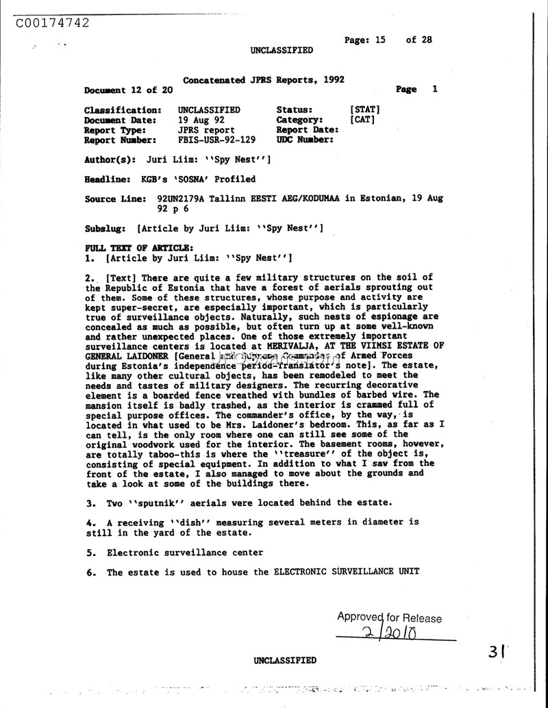 This document, a JPRS report dated August 19, 1992, authored by Juri Liim, provides an intelligence profile regarding a clandestine military facility in Estonia. The author describes the presence of numerous military structures across Estonia, specifically focusing on a highly secret surveillance center located at the Viimsi Estate of General Laidoner in Merivalja. The estate, formerly belonging to the Supreme Commander of the Armed Forces during Estonia's independence period, has been repurposed for military use. The author notes that the site is heavily fortified with barbed wire and contains special-purpose offices. Observations made by the author include the presence of two 'sputnik' aerials behind the estate and a large receiving dish in the yard. The facility is identified as housing an electronic surveillance unit, with the author noting that the interior of the mansion has been significantly altered to accommodate these operations.