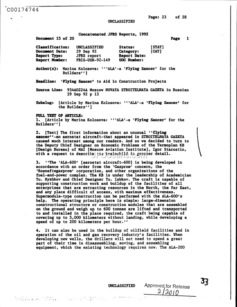 This document, a 1992 JPRS report, details the development of a large-scale aerostat aircraft known as the ALA-600. The project, initiated by the Termoplan Design Bureau at the Moscow Aviation Institute, was commissioned by the Gazprom concern and the Rosneftegazprom corporation. Under the leadership of Academician Yu. Ryzhkov and Chief Designer Yu. Ishkov, the craft is designed to assist in construction and resource extraction in remote areas such as the North and the Far East. The ALA-600 is described as a 'flying saucer' type aerostat capable of lifting and transporting up to 600 tonnes of construction modules. It is engineered to travel up to 5,000 kilometers without landing at speeds reaching 200 kilometers per hour. The primary utility of the craft is to streamline the assembly and disassembly of oilfield and gas recovery facilities, thereby reducing the time and logistical challenges associated with traditional construction methods in difficult terrain.