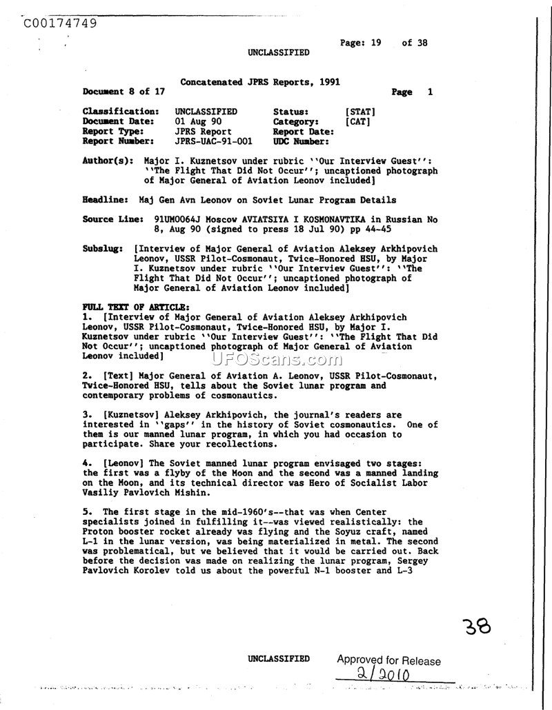This document is a transcript from a 1991 JPRS report, originally published in the Moscow journal AVIATSIYA I KOSMONAVTIKA in August 1990. It features an interview conducted by Major I. Kuznetsov with Major General of Aviation Aleksey Arkhipovich Leonov, a twice-honored Hero of the Soviet Union and a Soviet pilot-cosmonaut. The discussion focuses on the history and technical details of the Soviet manned lunar program. Leonov explains that the program was divided into two distinct stages: an initial flyby of the Moon and a subsequent manned landing on the lunar surface. The technical direction of this effort was under the leadership of Vasiliy Pavlovich Mishin, a Hero of Socialist Labor. Regarding the mid-1960s, Leonov notes that the first stage was viewed as realistic by specialists at the time, with the Proton booster rocket already in flight and the L-1 version of the Soyuz spacecraft being developed. He also mentions that prior to the formal decision to proceed with the lunar program, Sergey Pavlovich Korolev had provided information regarding the development of the powerful N-1 booster and the L-3 system.