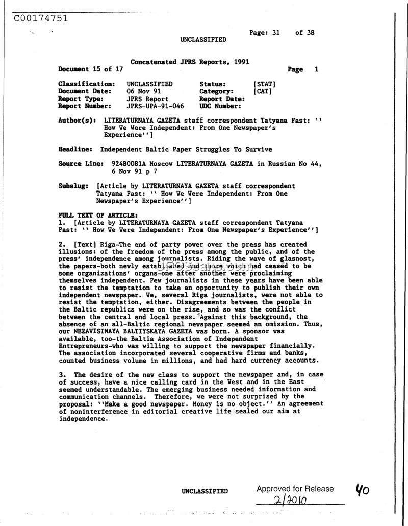 This document, a JPRS report dated November 6, 1991, provides a journalistic account of the shifting media landscape in Riga, Latvia, during the period of glasnost. Written by LITERATURNAYA GAZETA correspondent Tatyana Fast, the article explores the transition from state-controlled media to independent journalism. The author notes that the collapse of party authority over the press created a wave of new, independent publications. The author and a group of fellow journalists in Riga sought to fill a perceived gap in the market by creating an all-Baltic regional newspaper, titled NEZAVISIMAYA BALTIYSKAYA GAZETA. The report highlights the financial realities of this endeavor, noting that the newspaper secured funding from the Baltia Association of Independent Entrepreneurs. This association, which included various cooperative firms and banks, provided the necessary capital to support the publication. The document emphasizes that the sponsors agreed to a policy of noninterference in the newspaper's editorial and creative processes, allowing the journalists to pursue their goal of independence while operating within the emerging business environment of the time.