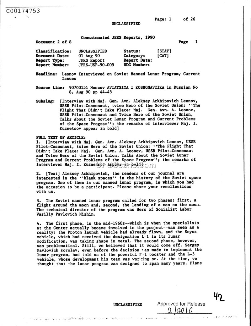 Leonov Interviewed on Soviet Manned Lunar Program, Current Issues