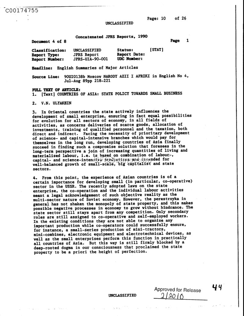 This document summarizes an article by V.N. Ulyakhin regarding the application of Asian economic models for small business development within the Soviet Union. It highlights the tension between Soviet state-property dogma and the need for a more flexible, multi-sector economy.