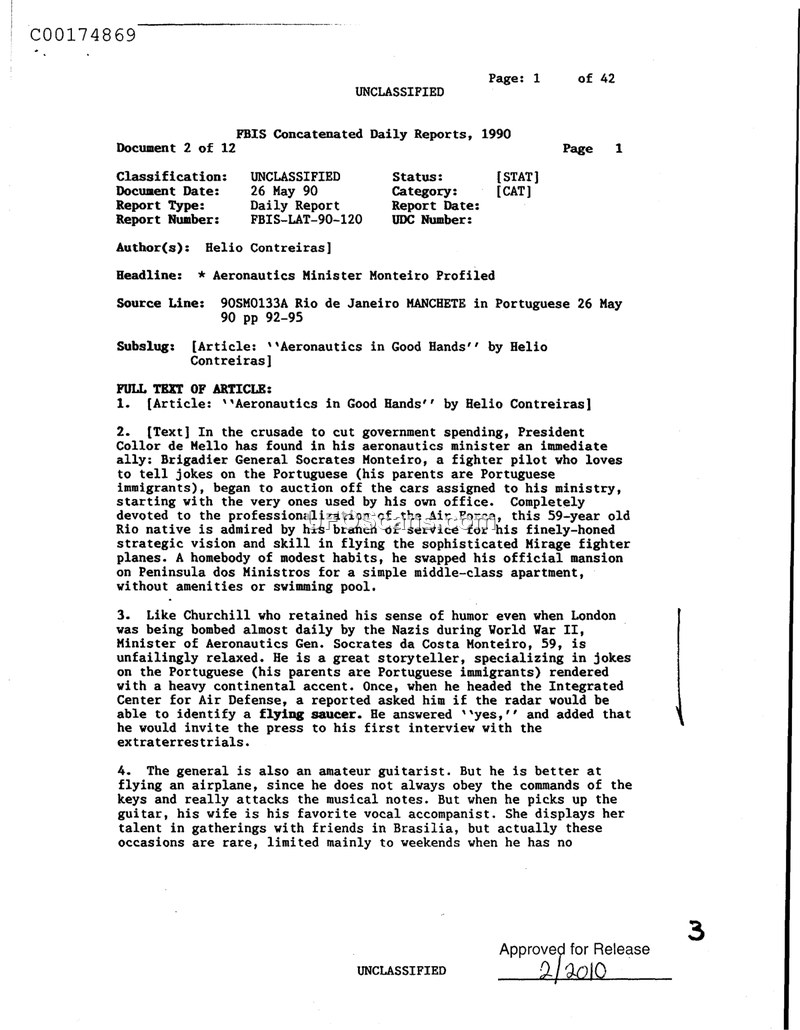 This document is a profile of Brigadier General Socrates Monteiro, the Brazilian Aeronautics Minister, written by Helio Contreiras and published in the FBIS Concatenated Daily Reports on May 26, 1990. The article highlights Monteiro's efforts to reduce government spending by auctioning off ministry vehicles and his commitment to the professionalization of the Brazilian Air Force. Described as a 59-year-old Rio native and a skilled pilot of Mirage fighter planes, Monteiro is portrayed as a modest individual who lives in a simple apartment. The text notes his sense of humor and storytelling ability, comparing him to Winston Churchill. A brief anecdote is included regarding his time heading the Integrated Center for Air Defense, where he was asked if he would be able to identify a flying saucer; he reportedly answered 'yes' and joked that he would invite the press to his first interview with the extraterrestrials. The profile also touches upon his personal life, mentioning his interest in playing the guitar.