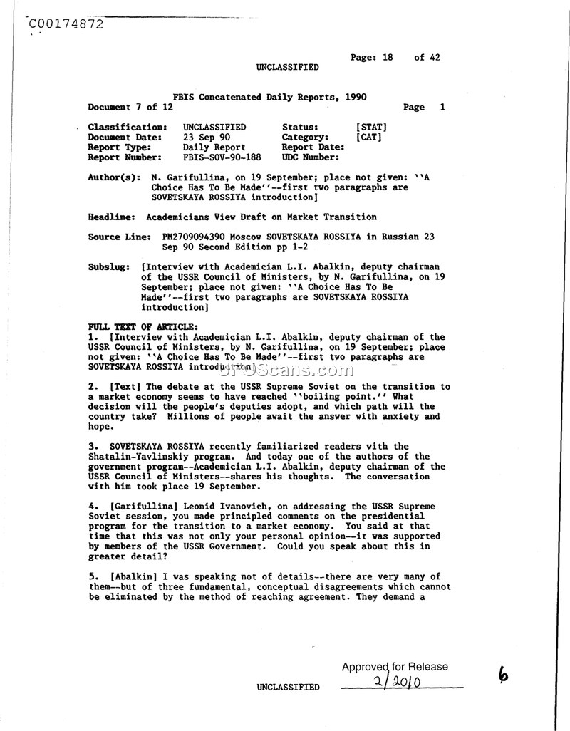 This document is a page from the FBIS Concatenated Daily Reports dated September 23, 1990. It contains an interview conducted by N. Garifullina with Academician L.I. Abalkin, the deputy chairman of the USSR Council of Ministers. The discussion centers on the intense political debate within the USSR Supreme Soviet regarding the country's transition to a market economy. Academician Abalkin addresses the Shatalin-Yavlinskiy program and notes that there are three fundamental, conceptual disagreements that prevent a consensus from being reached. The text highlights the political tension and public anxiety surrounding the economic future of the Soviet Union during this period.