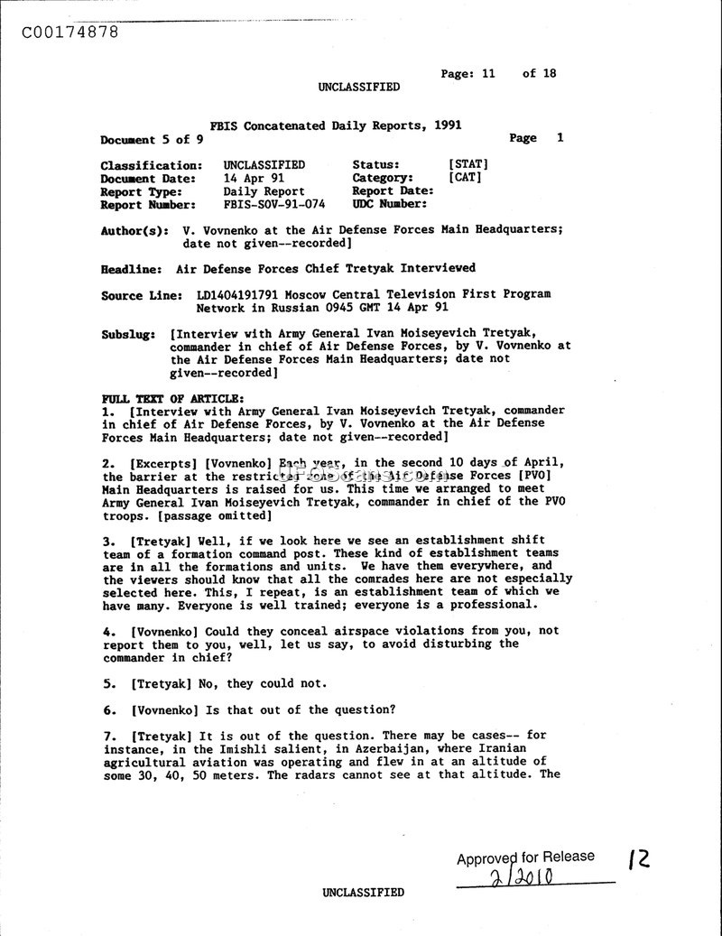 FBIS Concatenated Daily Reports, 1991 — Air Defense Forces Chief Tretyak Interviewed