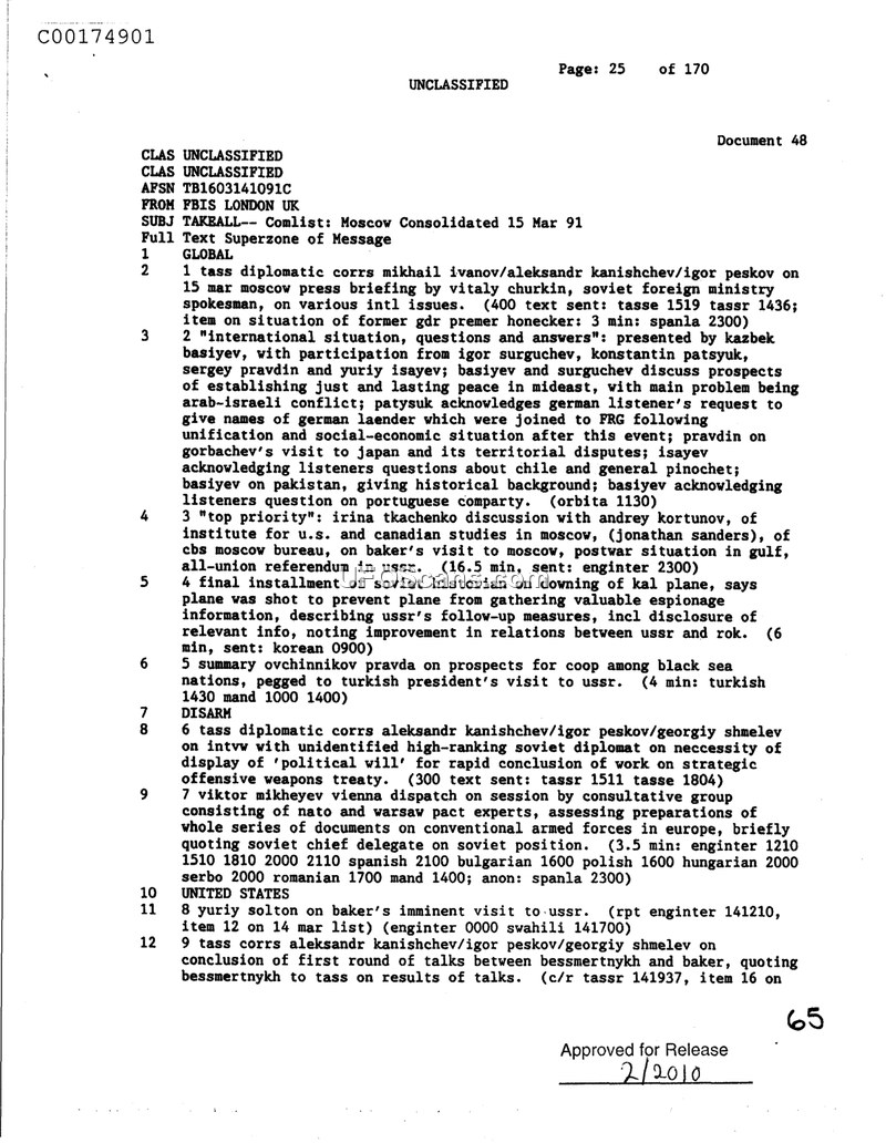 This document is a Foreign Broadcast Information Service (FBIS) summary of Moscow-based news and diplomatic briefings dated March 15, 1991. The report covers a variety of international and domestic issues, including a press briefing by Soviet foreign ministry spokesman Vitaly Churkin regarding the situation of former GDR premier Honecker. It details an international discussion program featuring Kazbek Basiyev and others, covering topics such as the Arab-Israeli conflict, German unification, Gorbachev's visit to Japan, and Chilean politics. The document also notes a discussion between Irina Tkachenko and Andrey Kortunov regarding U.S. Secretary of State Baker's visit to Moscow and the postwar situation in the Gulf. Additionally, it mentions a Soviet historian's perspective on the downing of a Korean Air Lines (KAL) plane, arguing it was shot down to prevent the gathering of espionage information. Finally, the report covers disarmament news, including a session by NATO and Warsaw Pact experts on conventional armed forces in Europe, and the conclusion of the first round of talks between Soviet diplomat Bessmertnykh and U.S. Secretary of State Baker.