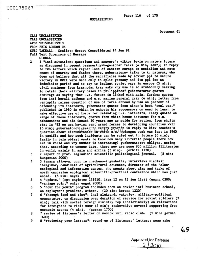 This document is a Foreign Broadcast Information Service (FBIS) summary of Moscow radio and press reports dated June 14, 1991. The report outlines various segments from Soviet media, including political commentary on NATO's future, discussions regarding the Soviet Union's role in WWII, and U.S. foreign policy. Specific segments cover a range of topics: a discussion on U.S. military bases in the Philippines; a review of Richard Nixon's book 'Real War' in the context of U.S. interventionism; and a segment addressing a question from a Kiev teacher regarding the loss of a U.S. hydrogen bomb in the Pacific in 1965. Other segments include a report on Professor Zagladin's politological journal, an interview with Vladimir Ibragimov regarding ecological issues in Checheno-Ingushetia, and discussions on the duration of military service for Soviet soldiers and the development of free economic zones.