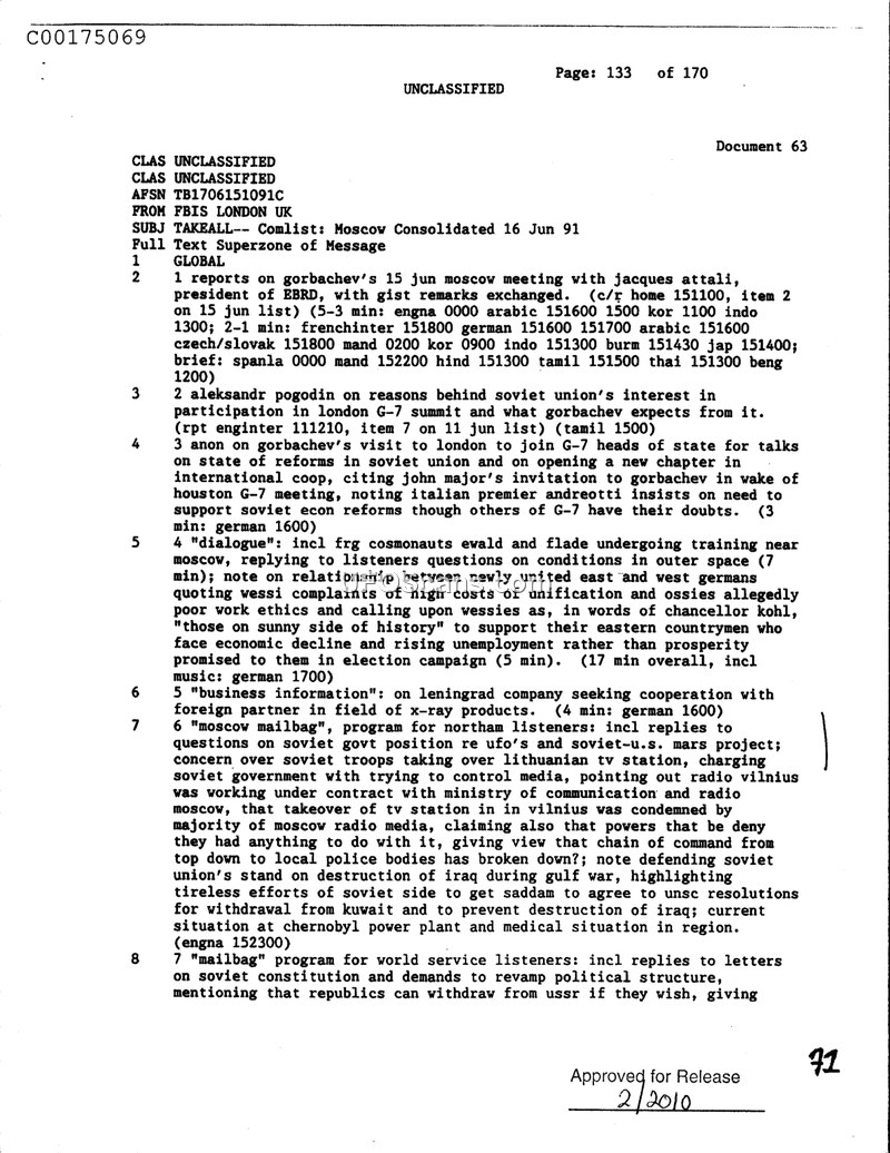 This document is a Foreign Broadcast Information Service (FBIS) summary of Moscow-based news reports dated June 16, 1991. The summary covers several key political and social topics within the Soviet Union at the time. It details Mikhail Gorbachev's meeting with Jacques Attali, the president of the EBRD, and discusses the Soviet Union's interest in participating in the London G-7 summit. The report also touches upon the state of economic reforms in the Soviet Union, the relationship between East and West Germans, and the training of FRG cosmonauts near Moscow. Notably, the document mentions a 'Moscow mailbag' program that addressed listener questions regarding UFOs and the Soviet-U.S. Mars project. Additionally, the report covers internal Soviet concerns, including the takeover of a television station in Vilnius, Lithuania, the Soviet stance on the Gulf War, and the situation at the Chernobyl power plant.