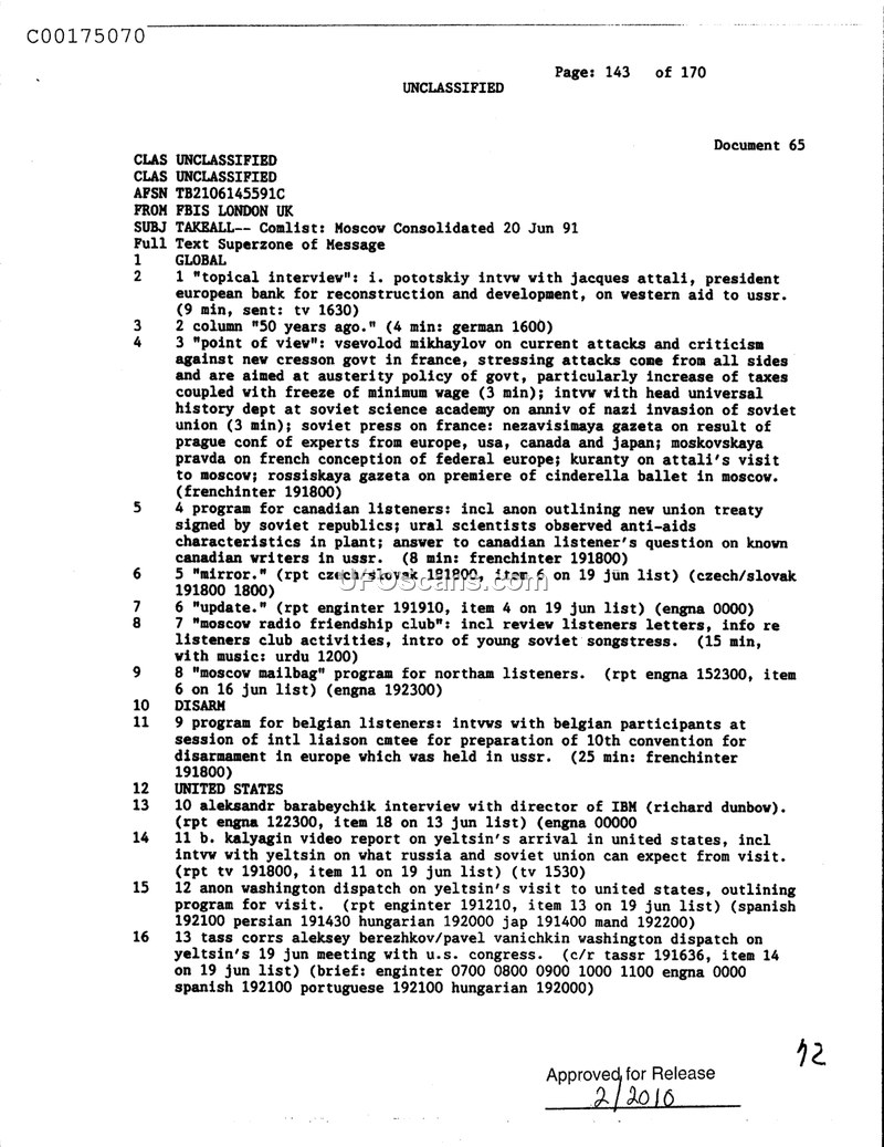 This document is a Foreign Broadcast Information Service (FBIS) summary of Moscow consolidated broadcasts dated June 20, 1991. The report outlines various news segments and interviews covered by Soviet media. Key topics include an interview with Jacques Attali, president of the European Bank for Reconstruction and Development, regarding Western aid to the USSR. Other segments cover Vsevolod Mikhaylov's commentary on the French government, a report from the Soviet Science Academy on the anniversary of the Nazi invasion, and a program for Canadian listeners regarding a new union treaty and anti-AIDS research. The document also details extensive coverage of Boris Yeltsin's visit to the United States, including his meeting with the U.S. Congress, reported by TASS correspondents Aleksey Berezhkov and Pavel Vanichkin. Additionally, it notes an interview with the director of IBM, Richard Dunbow, conducted by Aleksandr Barabeychik.
