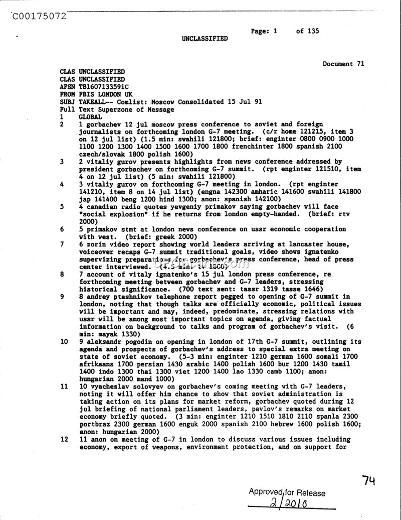 This document is an FBIS compilation of news reports from July 15, 1991, detailing President Gorbachev's attendance at the G-7 summit in London. It covers Soviet media perspectives on economic reforms and diplomatic relations with Western leaders.
