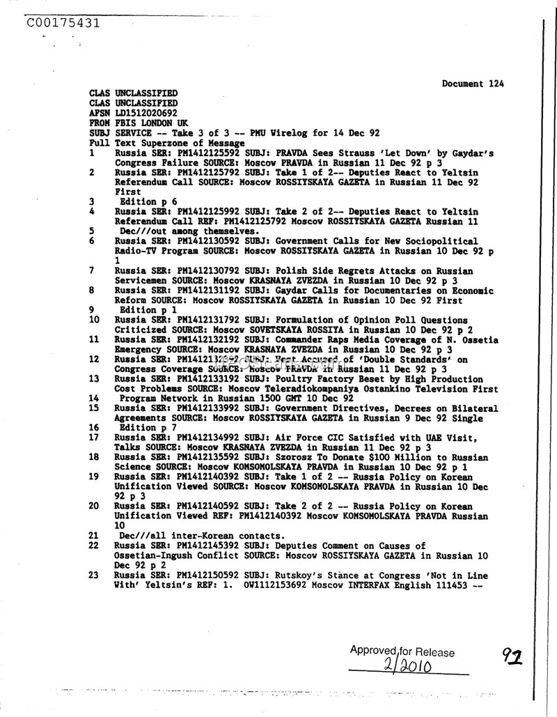 This document is a Foreign Broadcast Information Service (FBIS) wirelog from London, dated December 14, 1992. It serves as a summary of various Russian media reports and political developments occurring in early December 1992. The wirelog lists 23 distinct items, each identified by a serial number, subject, and source. The content primarily focuses on the political climate in Russia following the failure of Gaydar's Congress, reactions to Yeltsin's referendum call, and various domestic issues including economic reform, the Ossetian-Ingush conflict, and the poultry industry's production problems. Additionally, the document notes international and military-related items, such as a report on the Air Force CIC being satisfied with a UAE visit and Russian policy regarding Korean unification. The document provides a snapshot of the Russian press landscape during a period of significant political transition.
