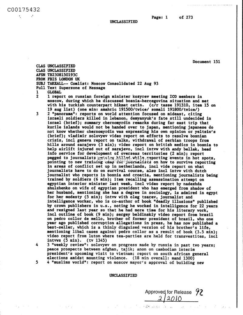 This document is a consolidated report from FBIS London dated August 22, 1993, summarizing various international news items and media reports. The document covers several geopolitical topics, including a meeting between Russian Foreign Minister Kozyrev and ICO members in Moscow, and discussions between Kozyrev and his Turkish counterpart, Hikmet Cetin. It notes the ongoing uncertainty regarding the fate of Demyanyuk in Israel and reports on Chernomyrdin's remarks during a Far East trip concerning the Kurile Islands, specifically highlighting ambiguity regarding whether his statements reflected his own views or those of President Yeltsin. The report also summarizes a video segment by Vladimir Solovyev regarding the Bosnian crisis, including efforts to resolve the conflict and the evacuation of injured individuals from Sarajevo. Other segments cover the training of journalists for survival in conflict zones, an assassination attempt on the Egyptian interior minister, and an interview with Oleg Tsarev, a journalist and former intelligence worker who co-authored the book 'Deadly Illusions.' Finally, the report mentions a video segment from Brazil concerning Pedro Collor de Mello, the brother of the former Brazilian president, and his recent book regarding corruption allegations, as well as a 'weekly review' segment covering Russian progress, peace prospects between Afghanistan and Tajikistan, and upcoming elections in South Africa.