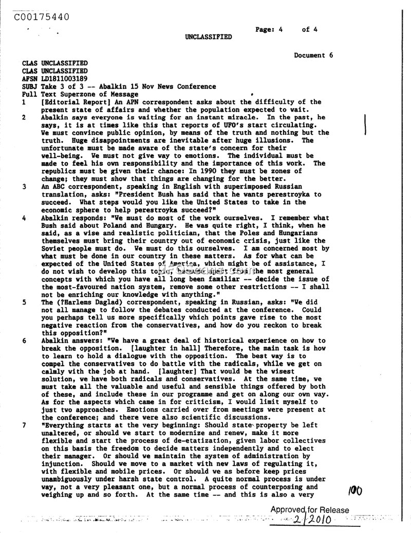 This document is a transcript of a news conference held by Abalkin on November 15, 1990. The text covers a range of topics concerning the Soviet Union's economic and political situation, specifically addressing the challenges of perestroyka. Abalkin discusses the public's desire for an 'instant miracle' and notes that, similar to reports of UFOs, people often look for miraculous solutions to complex problems. He emphasizes that the Soviet people must take responsibility for their own economic recovery, referencing the political transitions in Poland and Hungary as examples. The discussion also touches upon the role of the United States, with Abalkin expressing a desire to avoid over-reliance on external assistance, focusing instead on internal reforms. Furthermore, the transcript details a dialogue regarding the political opposition within the Soviet Union, where Abalkin outlines a strategy for managing both radical and conservative factions through dialogue and the selective adoption of useful policies. The document concludes with a brief mention of potential economic reforms, including the modernization of state property and the transition to a market-based system with flexible pricing.