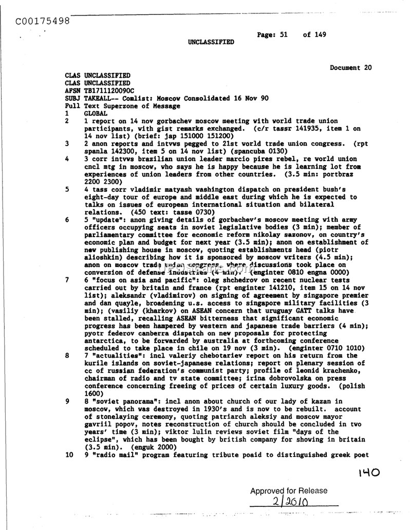 This document is a consolidated news report dated November 16, 1990, summarizing various international and domestic Soviet news items. The report covers a wide range of topics, including a meeting between Mikhail Gorbachev and world trade union participants in Moscow, and reports on the 21st World Trade Union Congress. It highlights international diplomatic activities, such as President George H.W. Bush's eight-day tour of Europe and the Middle East, and the signing of an agreement regarding U.S. access to Singaporean military facilities by Singaporean leadership and U.S. Vice President Dan Quayle. Domestic Soviet news includes discussions on economic reform, the conversion of defense industries, and the reconstruction of the Church of Our Lady of Kazan in Moscow, which was destroyed in the 1930s. The report also touches on regional issues, such as nuclear testing by Britain and France, ASEAN concerns regarding GATT talks, and environmental proposals for Antarctica. Additionally, it mentions cultural items, such as a review of the Soviet film 'Days of the Eclipse' and a radio program tribute to a Greek poet.